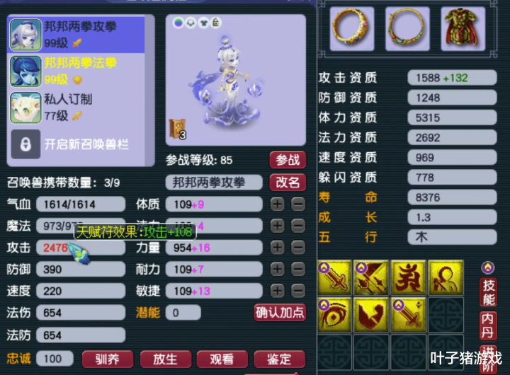 诸天处死素有“物理须弥”之称,好像陶冶召唤兽的物理袭击。别称89级雇主艺妙手胆大,不仅合出了一只7手段、1720攻资、1.3满成长的诸天泪妖,还将其打周详红,并赐福出4个手段。在全力加点并打上天禀符的情况下,这只泪妖的袭击属性高达2584,号称勇武组最牛的“一拳”超宠!