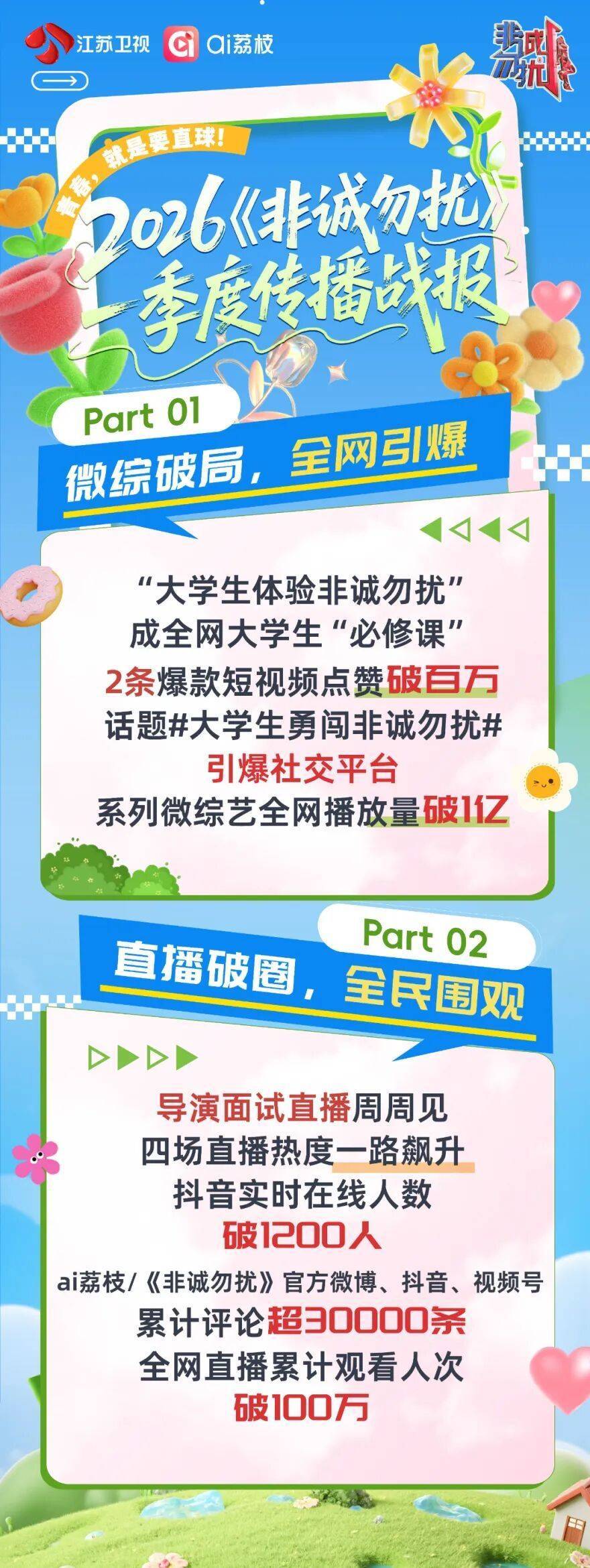 前年年底,《非诚勿扰》推出微综艺《大学生体验非诚勿扰》,信得过纪录大学生参与节目次制台前幕后的全历程,从体验经典的出场到自我先容,全景式展现大学生男女嘉宾相亲疏通互动,并千里浸式体验“爱之再判断”、“男生职权”或“女生职权”等节筹算志性措施。适度现在,该系列节目已更新7集,这一“号外篇”在抖音、小红书等外交平台马上引爆,“大学生勇闯非诚勿扰”“00后亦然到了上非诚勿扰的年龄”等话题引发网友热议,抖音上多条百万赞爆款实验频出,全网短视频播放量破亿。