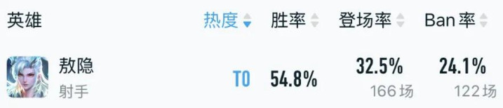 敖隐最近在KPL比赛中登场166次胜率高达54.8%,这个胜率远超狄仁杰