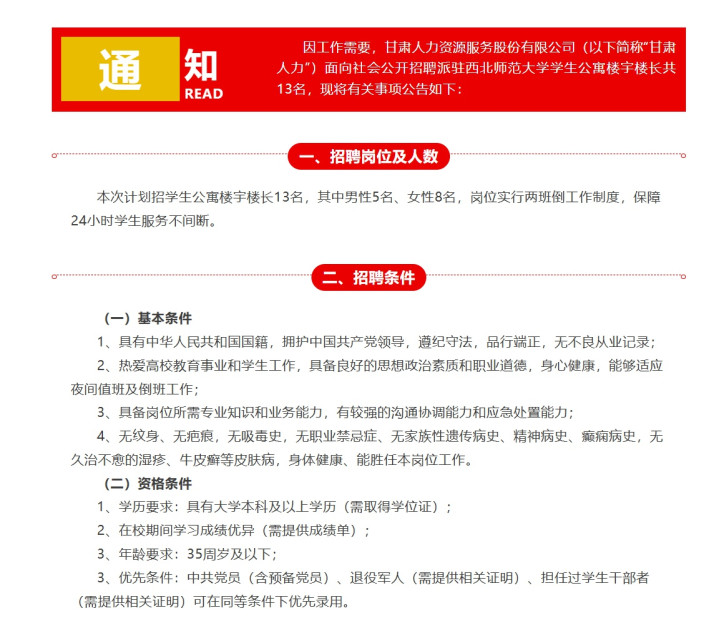 近日,甘肃东谈主力资源职业股份有限公司(以下简称“甘肃东谈主力”)面向社会公开招聘派驻西北师范大学学生公寓楼宇楼长共13名,条目具有大学本科及以上学历,年岁在35周岁以下。对此,有网友发帖称“宿管大姨齐要修业历了,这宇宙真实颠成了我不相识的样式”,评述区也有自称口试者的东谈主称,“收到口试见知,月薪4000元不包食宿。”