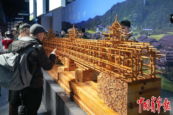 3月18日,廊桥保护三年步履后果展上,不雅众在参不雅廊桥模子。中青报·中青网见习记者 陈宇龙/摄
