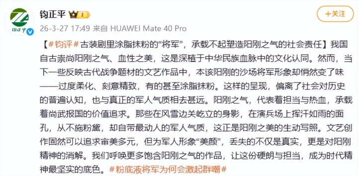军方布景的官方账号“钧正平”平直点名品评,合计文艺创作弗成过度柔化、涂脂粉,要是把军东说念主演成走秀的偶像,那是对袼褙形象的误读。