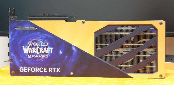 显卡的后头磋磨通常极具亮点,浅显而不只调,将虚空元素与硬件实用性完整集中。金属背板金和蓝黄金分割双拼色,蓝色部分印有“World Warcraft”的联名记号“MIDNIGHT”字样,还有GEFORCE RTX身份信息,字体领受热烈的磋磨作风,与显卡的合座线条相呼应,仿佛是用虚空能量镌刻而成,极具辨识度。