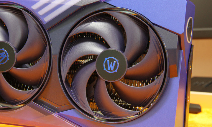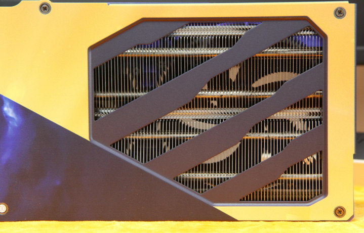 金色部分的散热鳍片区域领受镂空磋磨,不仅能够擢升散热着力,更能让玩家透过镂空处看到里面的热管与散热结构,而况在镂空上还故意用玄色彩材质复刻了一个暴雪的图形LOGO,兼具不雅赏性与实用性。