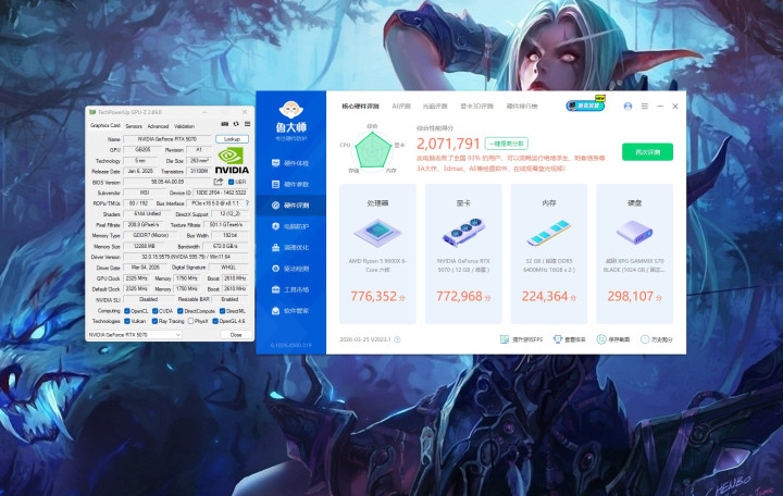 在直指夙昔图形本事的3DMARK Speed Way与Port Royal光追专项测试中,微星RTX 5070 12G“至暗之夜·虚空OC”范围版透澈撕开了虚空的帷幕,展现出令东说念主咋舌的光影支配力:Speed Way测试中,其凭借新一代架构对全局光照的极致优化,在高分辨率压力下照旧跑出了5607;而Port Royal测试更是其高光时刻,专属OC频率让光芒跟踪中枢火力全开,分数13698更解释了这张范围版显卡不仅是储藏佳品,更是足以在4K光追画质下冷静开导艾泽拉斯的终极利器。