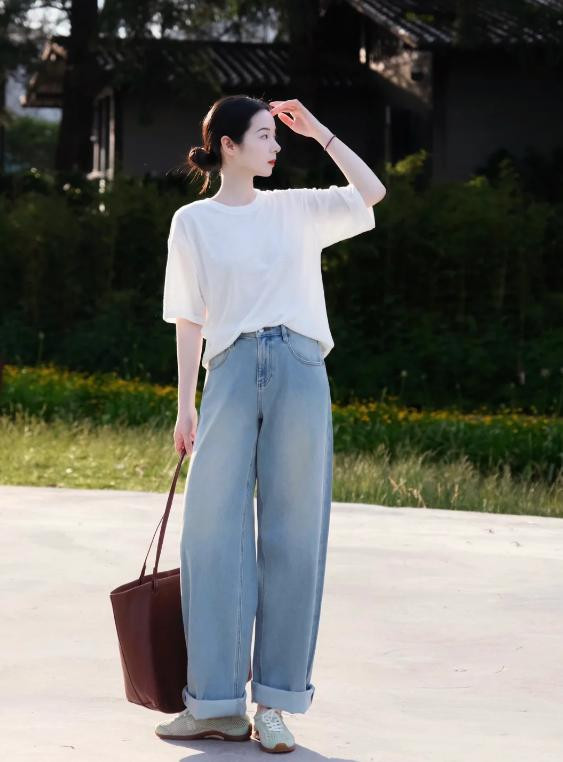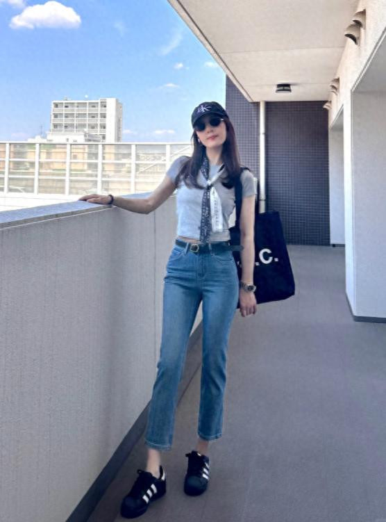 穿搭是一门常识。春天穿牛仔裤配德训鞋,懂得优化形体比例,智商躲闪五五分、小个子的问题。最基础的T恤+牛仔阔腿裤,不错把前边的衣摆塞进裤腰,裤腿挽起两谈穿,炫耀德训鞋的鞋面,眇小不浑沌。