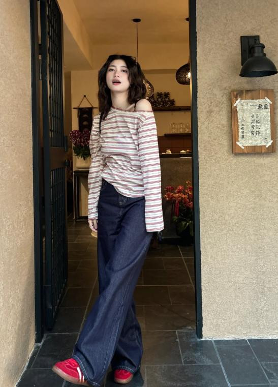 条纹元素的宽松罩衫被行为斜肩来穿。搭配高腰形貌的薄款牛仔阔腿裤,很是和顺况且能擢升气质。如若你嗅觉一套造型普无为通,那么脚上那双红色的清醒鞋,坐窝就注入了活力。