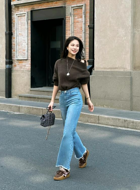 性感又熟悉的斜肩毛衣,再见守旧的牛仔微喇裤,又好意思又飒。棕色的训鞋和毛衣同色,再拎上一款小香风链条包,紧密感扑面而来!